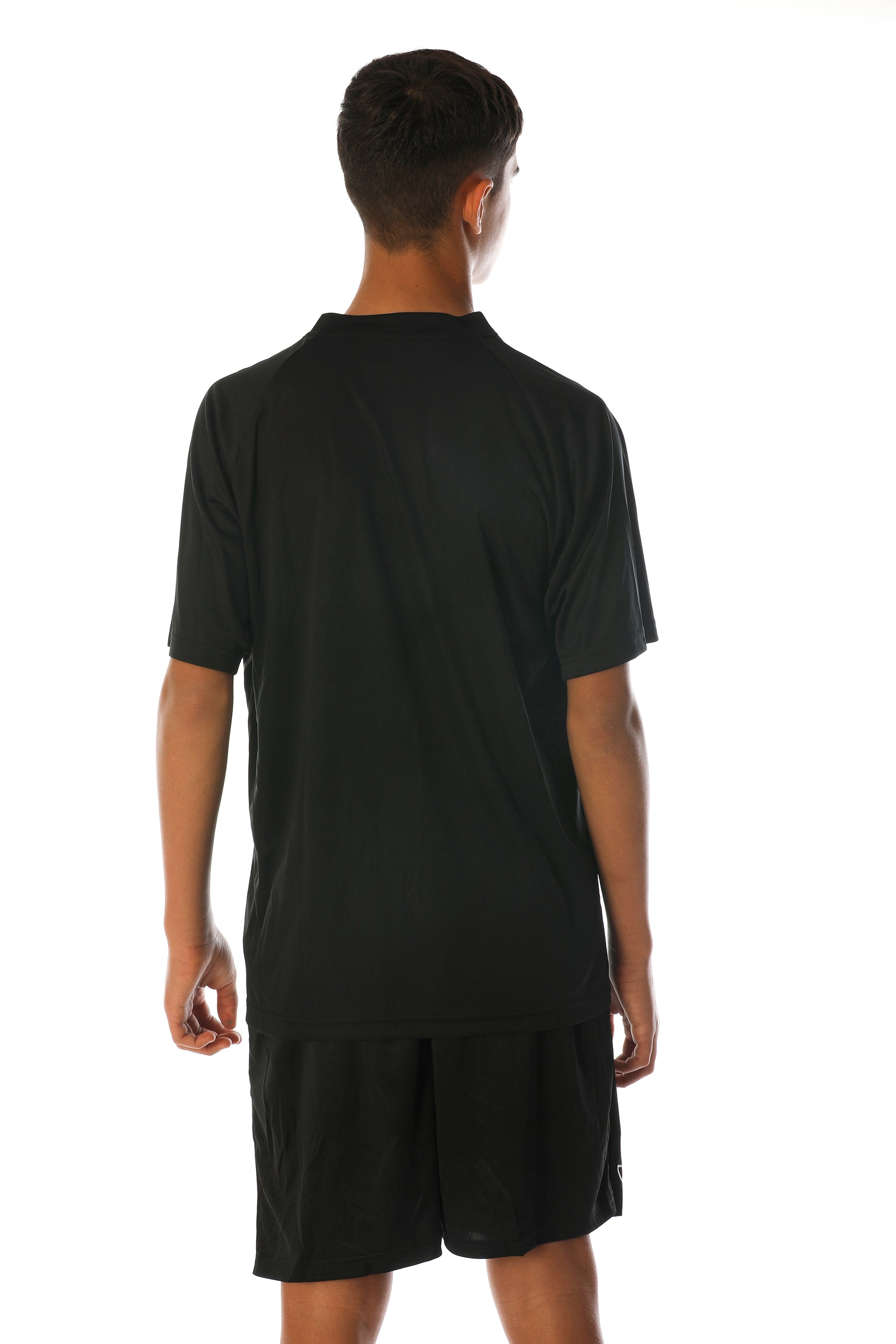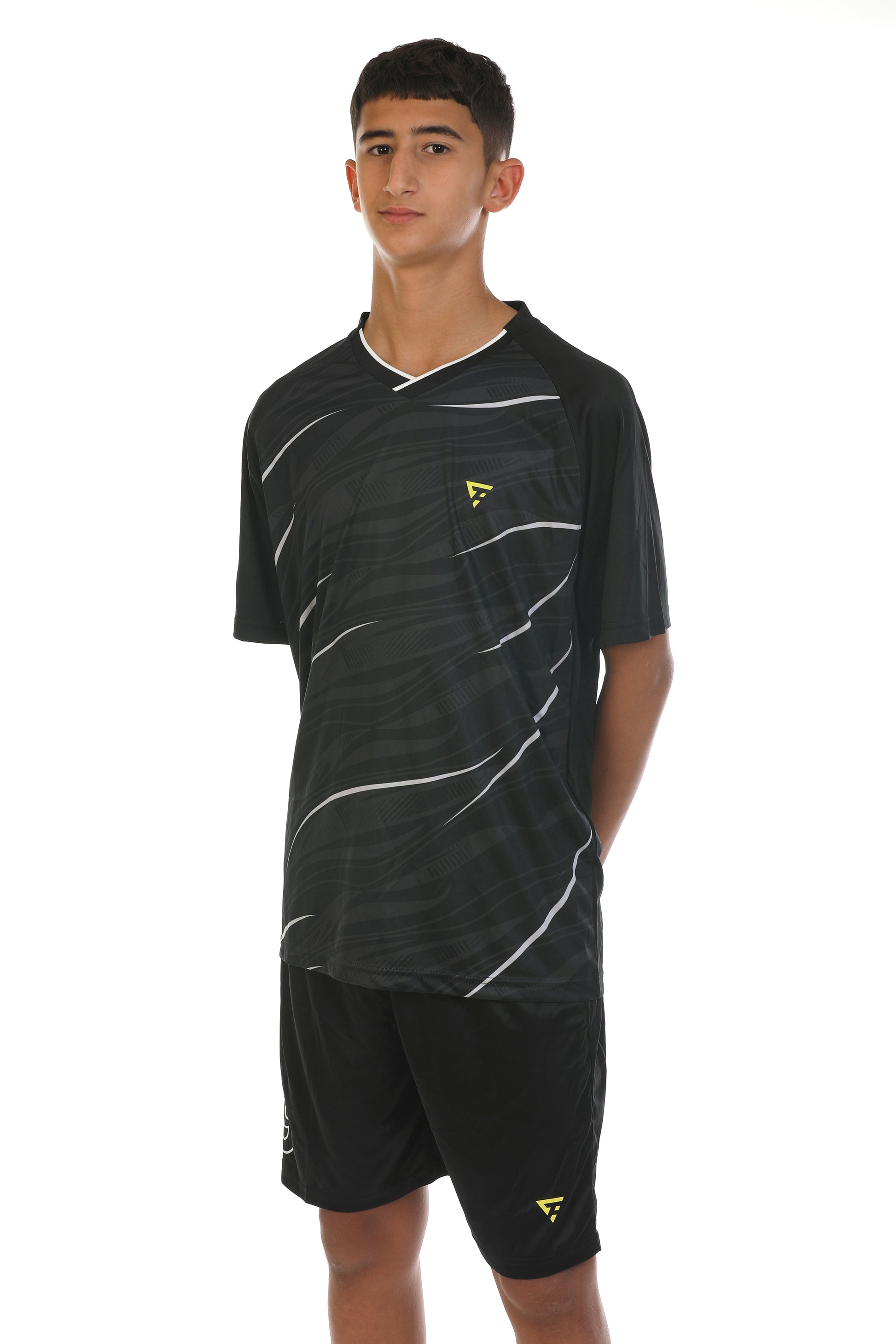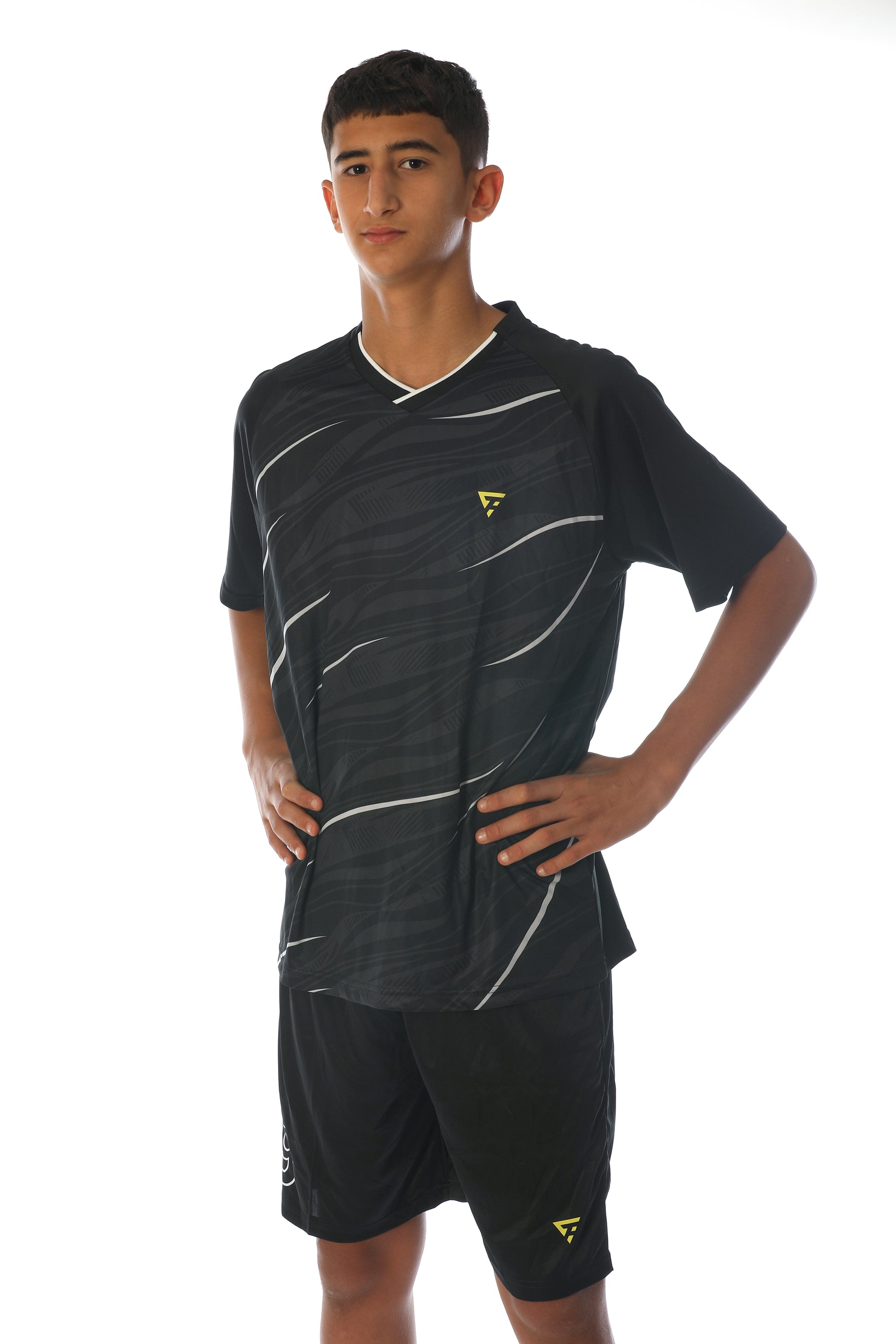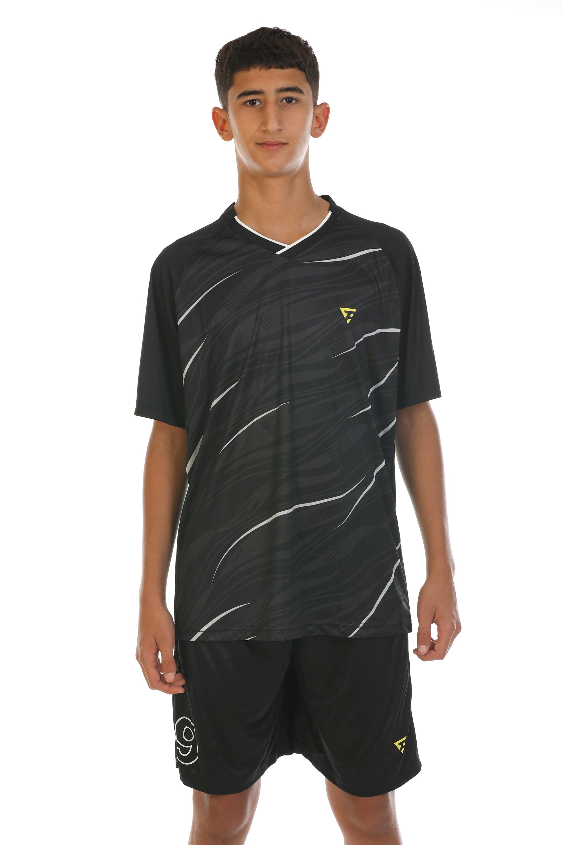 Un uniforme diseñado para destacar dentro y fuera del campo. Conjunto personalizado compuesto por camiseta y pantalón corto en color negro, con un elegante diseño de franjas blancas que aportan contraste, estilo y personalidad. Perfecto equilibrio entre rendimiento y estética, ideal para equipos que quieren lucir profesionales y con identidad propia.