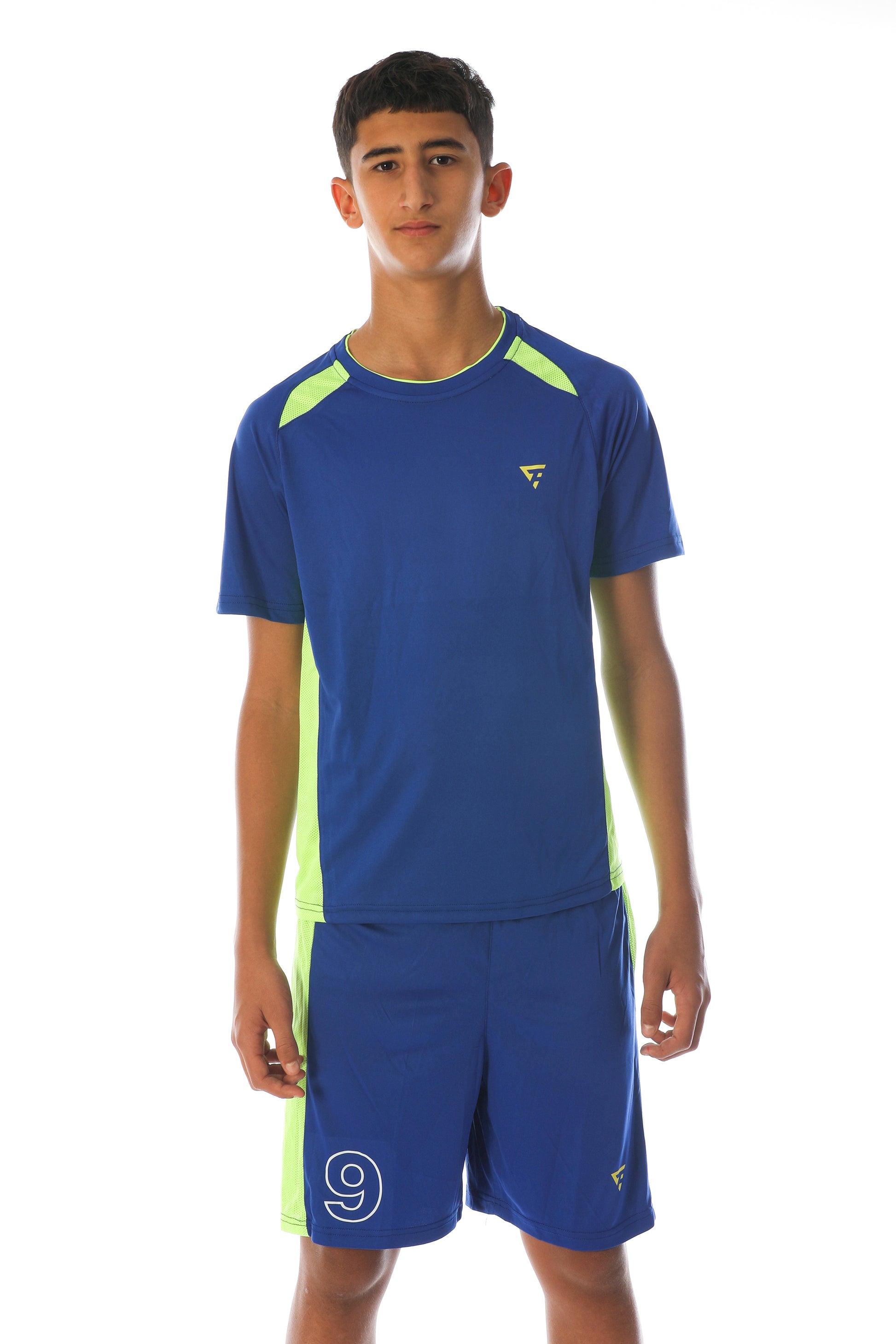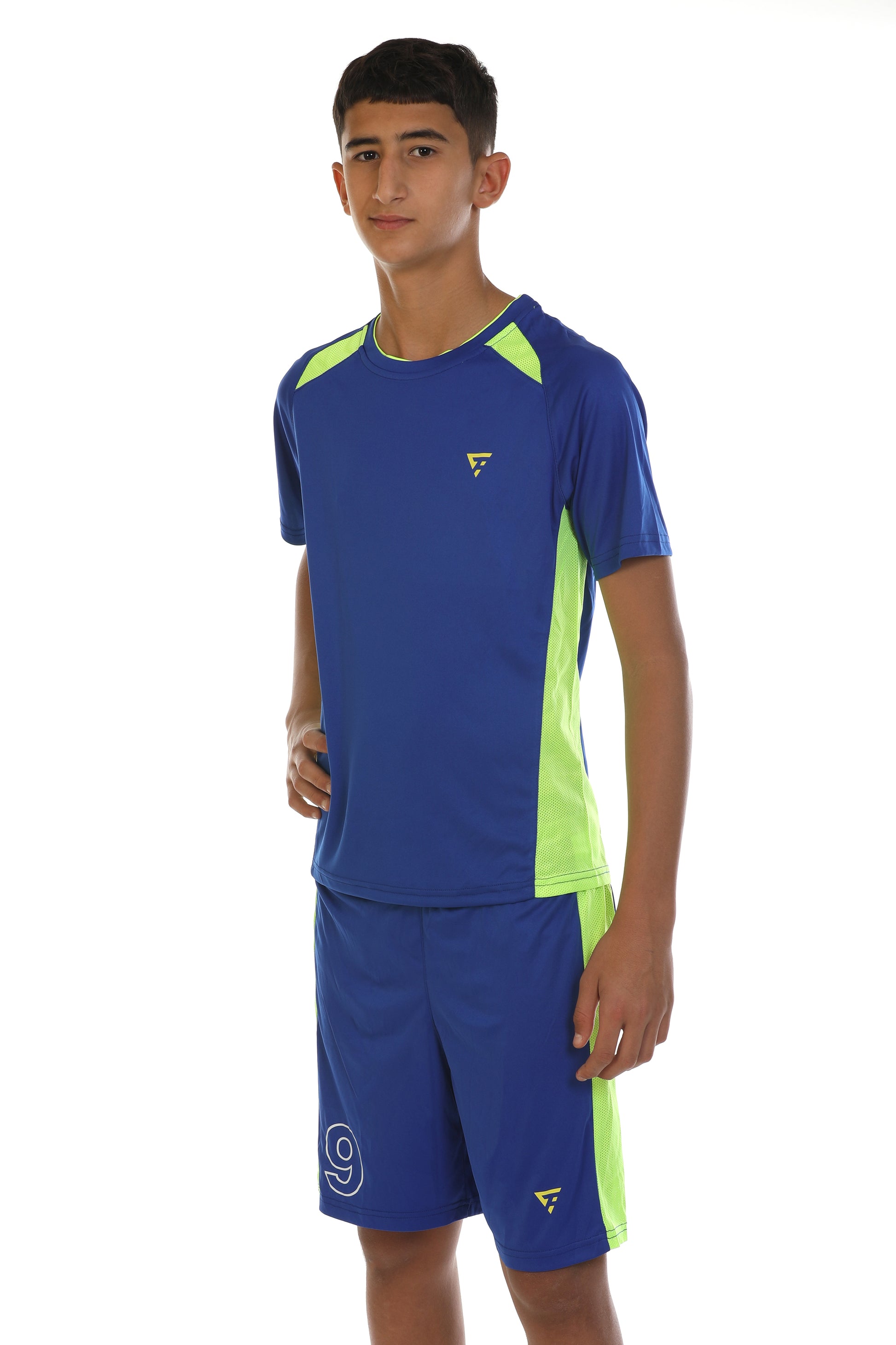 Equipación con estilo moderno y su combinación de colores vibrantes. Está compuesto por una camiseta azul royal con detalles en color verde fluorescente en los hombros, laterales y cuello, aportando un contraste enérgico y actual. El diseño es limpio y aerodinámico, pensado para ofrecer comodidad, transpirabilidad y libertad de movimiento durante el juego.